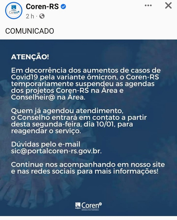 Em virtude, do agravamento da pandemia causada pelo COVID, foi necessário o cancelamento das atividades do Coren na Área de janeiro de 2022. Estudamos uma nova data e informaremos a categoria o mais breve possível.