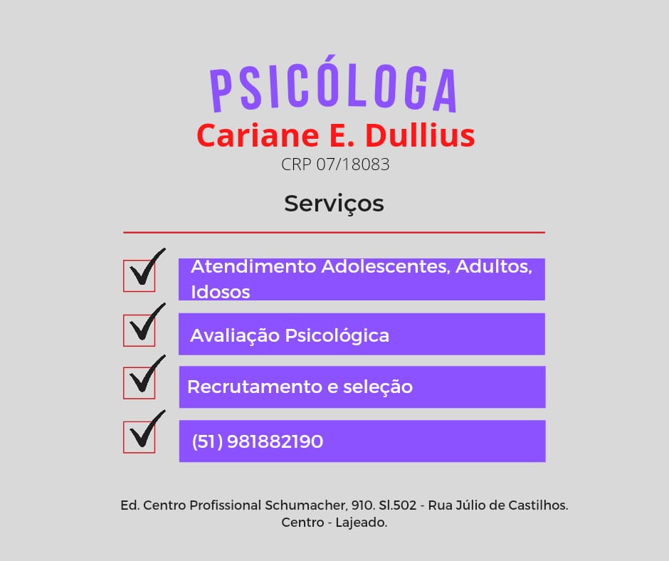 O Sindisaúde-VT disponibiliza o atendimento da psicóloga Cariane Emanuela Dullius, que oferece aos trabalhadores da área da saúde, vinculados ao Sindicato, sócios ou não sócios e seus familiares os seus serviços de consulta individual. Além do desconto convênio, após a primeira consulta 10% desc.